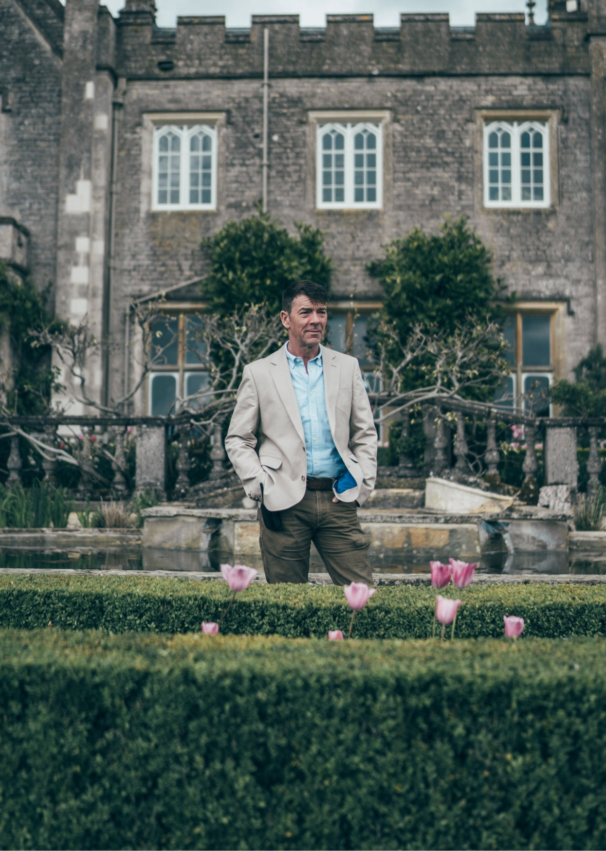 Jamie is also pictured wearing our linen shirt in Moss. There is nothing that says “summer” more than a linen shirt. Its ability to help keep you cool as temperatures rise is second to none and its slightly crumpled look adds a relaxed air. He is also pictured wearing our button down Oxford shirt in light blue stripe, the most versatile shirt you can own, it’s also the one we are most proud of.