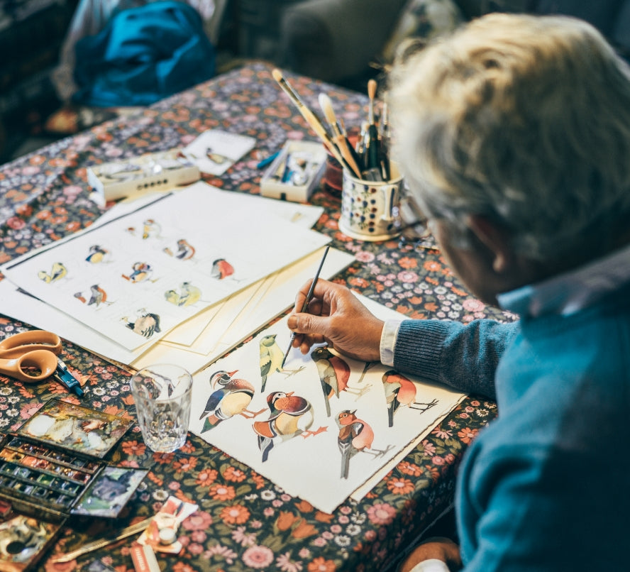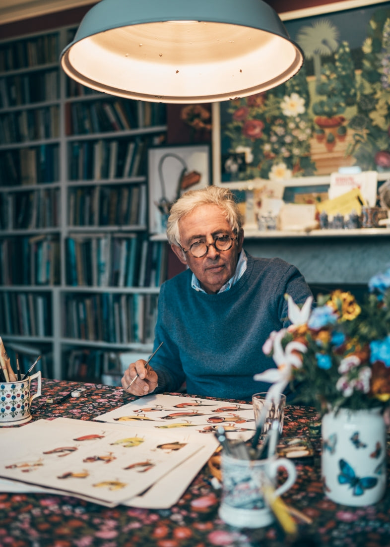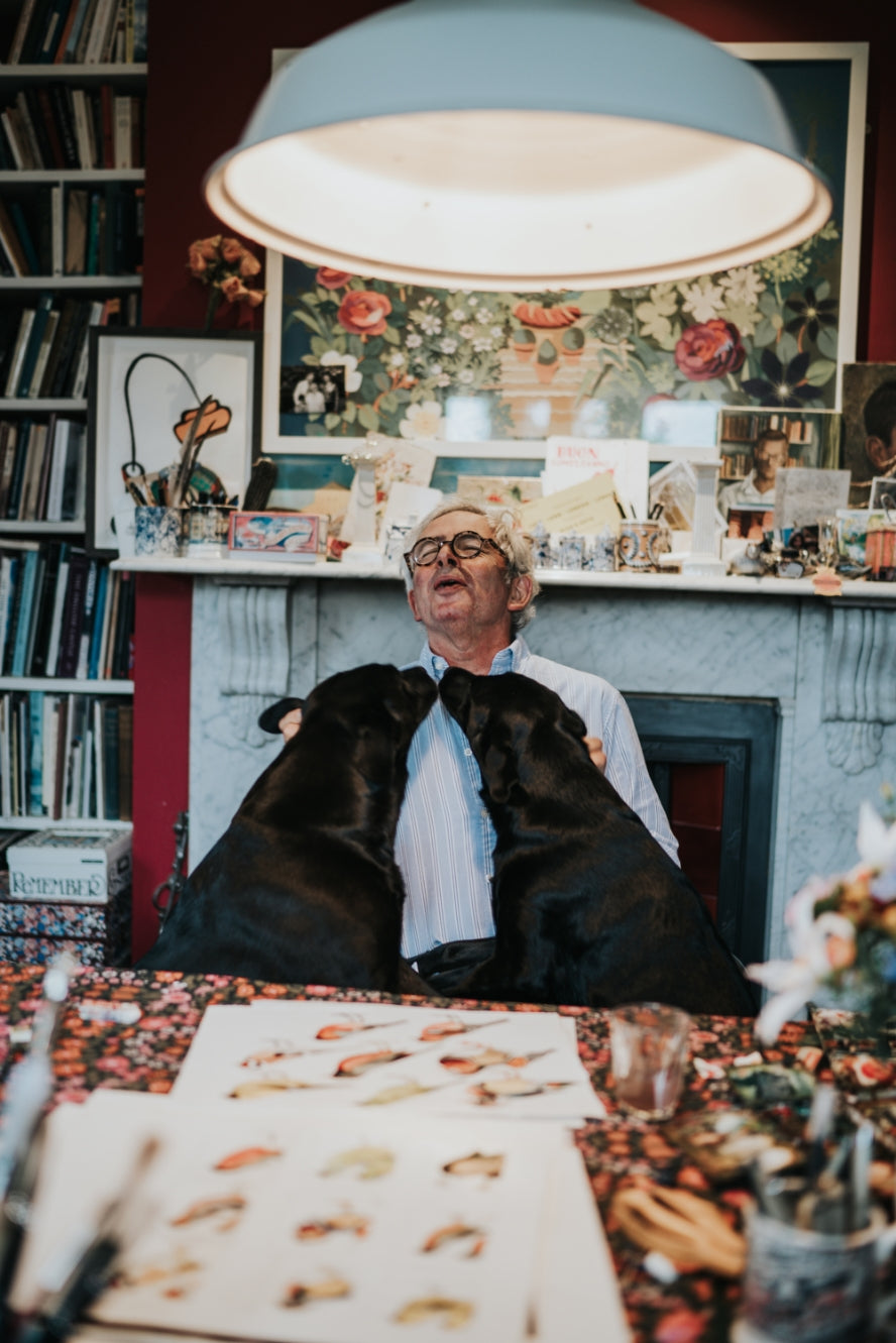 Matthew walks in and out of his studio all day, easily distracted from his drawing by more instantly gratifying temptations in his garden and beyond. Whether writing, illustrating or designing mugs and other household goods for Emma Bridgewater, his work is focussed on watercolour. He works alone on a wooden table with a cosy fire at his back and two black labs on the sofa.
